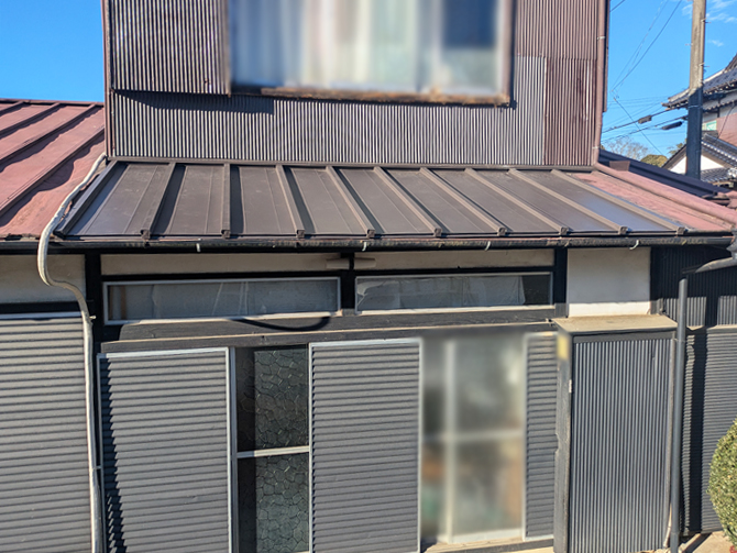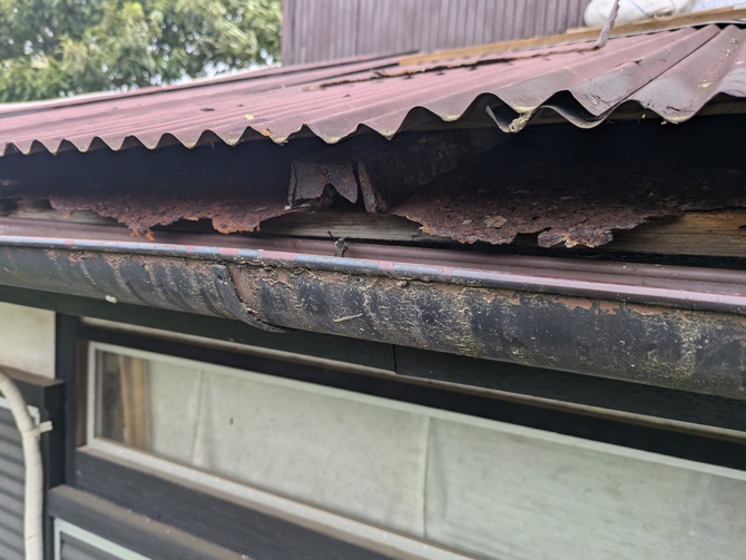 既存屋根の上から波トタンを重ね張りする補修が行われていましたが、