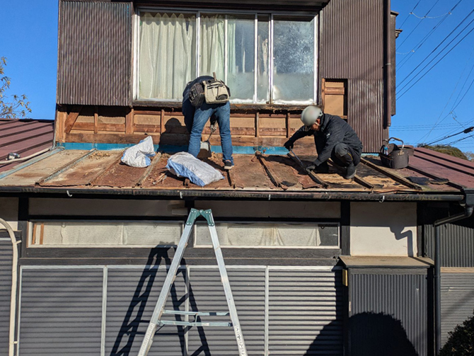 まずは重ね張りされていた波トタンと、その下の瓦棒屋根を慎重に撤去。