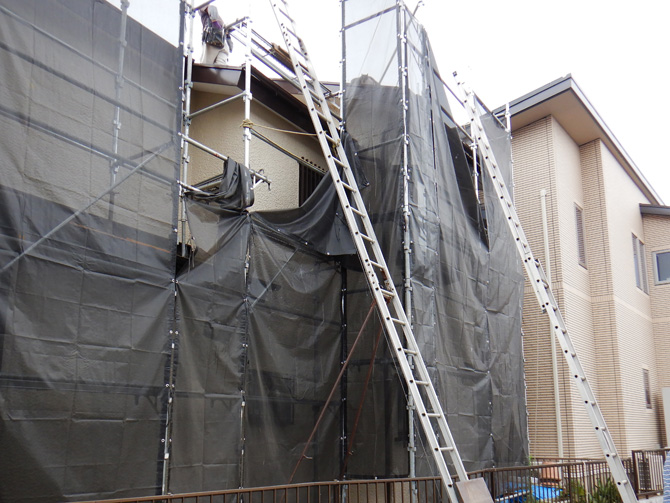 安全性と作業効率を確保するため、屋根全体を囲む足場を設置