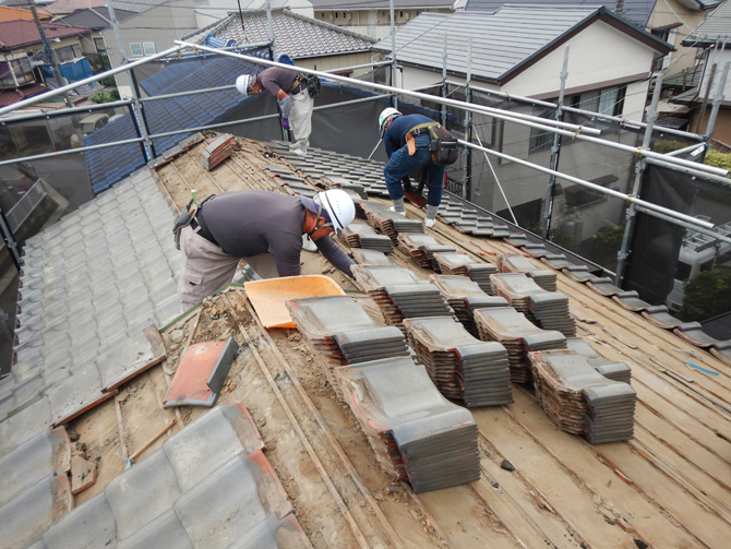 古い瓦を一枚ずつ丁寧に取り外し、処分します。