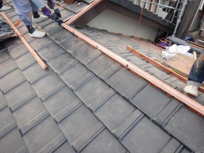 新しい瓦を荷揚げし、ガイドライン工法で施工。