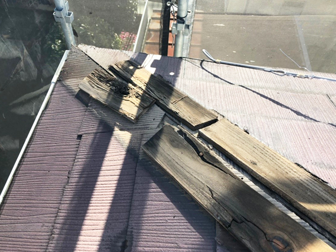 飛散する棟板金の多くは、下地(貫板ぬきいた)が傷んでいます。