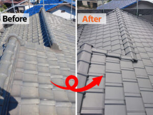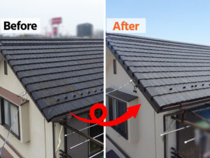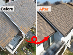 屋根全体にコケやカビが発生し、防水性が低下している状態でしたが、